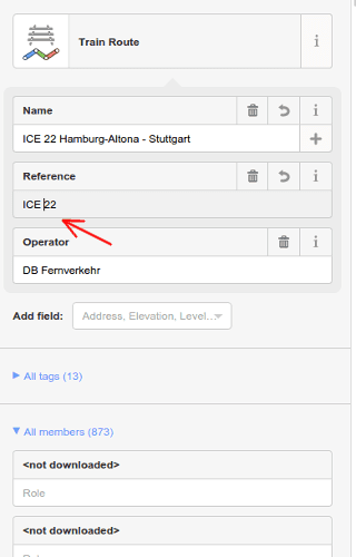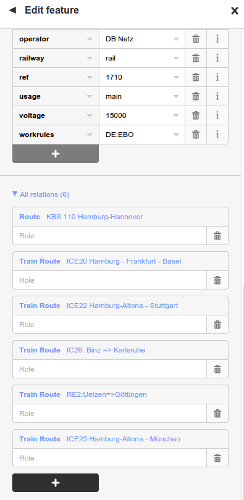 Ein Klick auf das Gleis öffnet links die Bearbeitungsanzeige für die Attribute der eigentlichen Geometrie ("way") und listet außerdem die Relationen auf, zu der der Weg gehört. In OSM können verschiedene Objekte mittels Relationen zusammengefasst werden, so dass es z.B. möglich ist, bestimmte Zugstrecken, die aus hunderten Einzelgeometrien bestehen, zu einem Objekt zu gruppieren.